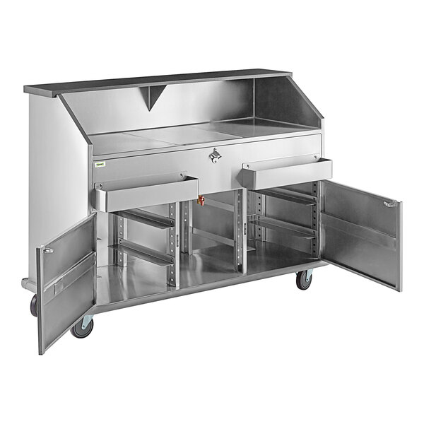 BAR PORTATIL DE ACERO INOXIDABLE CON 4 RUEDAS Y FRENO, TINA DE HIELO DE 16 X 20 PG Y TAPA EXTRAIBLE, PROTEGIDO CON PARACHOQUES A LOS COSTADOS
