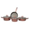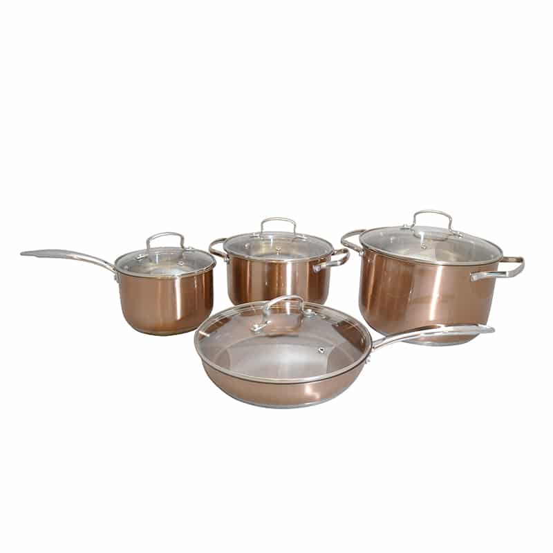 Batería Ámbar que incluye una olla de 18 cm con tapa de cristal, olla de 24 cm con tapa de cristal, cazo de 16 cm con tapa de cristal y sarten de 24 cm con tapa de cristal