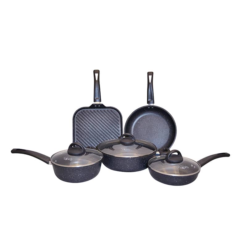 Batería Milán 8 pz que incluye un sarten de 20 cm, sarten de 26 cm, comal cuadrado 25 cm, budinera de 26 cm, cazo de 20 cm, 2 tapas de cristal de 20 cm y una tapa de cristal de 26 cm