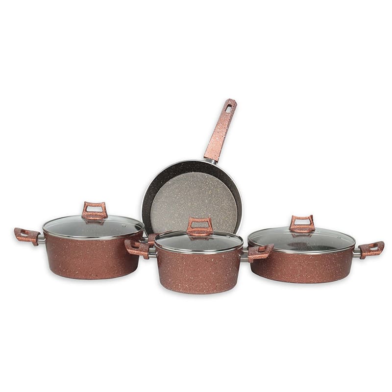 Batería Orquídea 7pz que incluye una olla de 24 cm tapa de cristal, olla de 20 cm con tapa de cristal, budinera 26 cm con tapa de cristal y sarten 26 cm