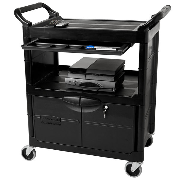 CARRO DE SERVICIO CON DOS PUERTAS CON CERRADURA Y REPISA DESLIZABLE PARA ESCRIBIR CAP. 300 LB 33 5/8 X 18 5/8 X 37 3/4 PG COLOR NEGRO RUBBERMAID