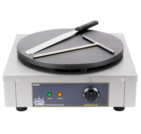 Crepera Carnival King Modelo CM16 – Electrica, 1 quemador de 16 pg, Ancho 17 3/4 pg, Profundidad 17 3/4 pg, Altura 7 1/4 pg, Voltaje 208/240, Potencia 2,450 – 3,265 vatios, control termostatico, 120 – 570 grados