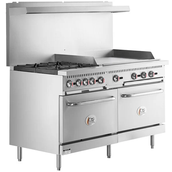 ESTUFA A GAS DE 4 QUEMADORES ABIERTOS 1 PLANCHA Y 2 HORNOS DE: 1.219 X 0.787 X 1.457 M COOKING PERFORMANCE
