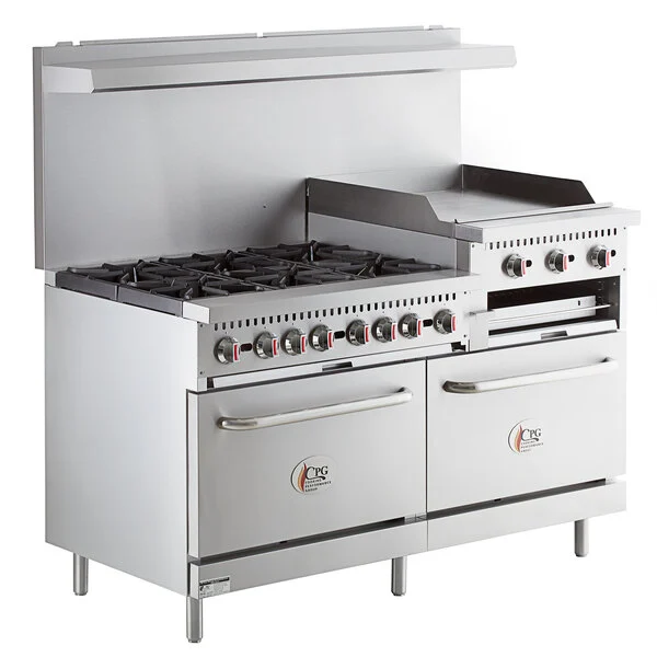 ESTUFA MULTIPLE DE 6 QUEMADORES CON DOS HORNOS ESTANDAR, PLANCHA DE 24 PG Y GRATINADOR MODELO S60-GS24-L MEDIDA GENERAL: 60 X 32 5/8 X 60 3/8 PG COOKING PERFORMANCE