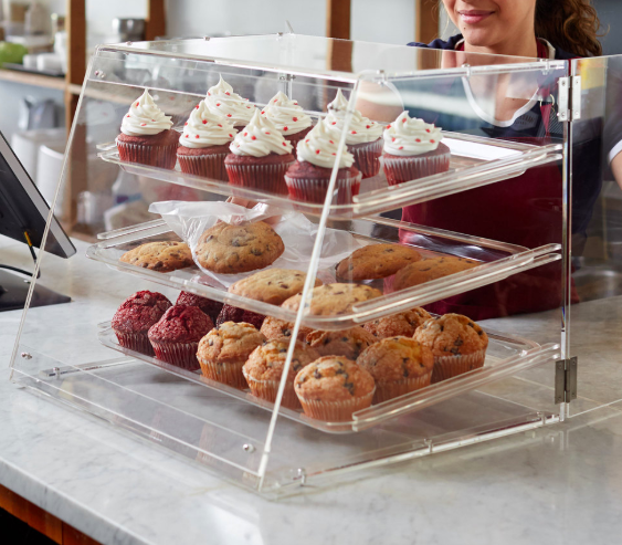 EXHIBIDOR PARA PANADERIA 3 CHAROLAS ACRILICO CON PUERTAS POSTERIORES 21 x 17 1/4 x 16 1/2 PG