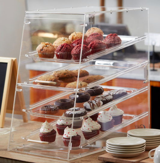 EXHIBIDOR DE PAN, DONAS Y CUPCAKES 4 CHAROLAS CON PUERTAS DE ACRILICO 22 x 14 x 24 SOBRE PEDIDO