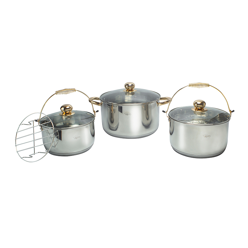 Tripleta en Acero Inoxidable 9 pzs que incluye olla vaporera de 28 cm con tapa de cristal, olla vaporera de 24 cm con tapa de cristal, olla vaporera de 22 cm con tapa de cristal y racks vaporizadores de 28, 24 y 22 cm