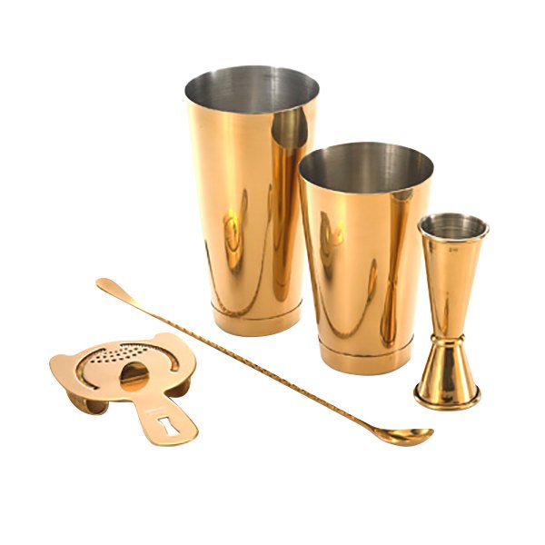 KIT PARA BAR 5 PIEZAS COLOR DORADO, COCTELERA BOSTON, CUCHARA DE BAR , JIGGER DE 1 Y 2 ONZAS Y COLADOR DE BEBIDAS