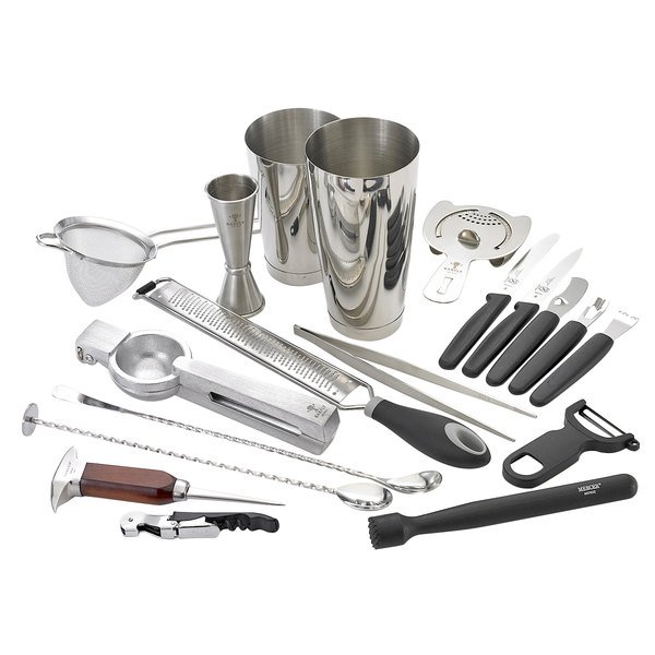 KIT PARA BAR 19 PIEZAS COLOR ACERO INOX, 1 COLADOR DE MALLA, PINZA, 2 CUCHARA DE BAR, MUDDLER, COLADOR DE BEBIDAS, JIGGER 1 Y 2 OZ, RALLADOR, EXPRIMIDOR, PELADOR, UTENSILIOS PARA CITRICOS, PICA HIELO Y SACACORCHOS