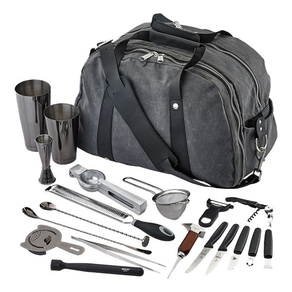 KIT PARA BAR 19 PIEZAS COLOR ACERO OBSCURO INCLUYE COCTELERA BOSTON, JIGGER, COLADOR DE MALLA Y DE BEBIDAS, PINZA, CUCHARA DE BAR, PICA HIELO, PELADOR, SET DE RALLADORES, SACACORCHOS, EXPRIMIDOR, MORTERO Y MALETA