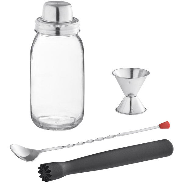KIT PARA BAR MODELO MASNBRKIT 4 PIEZAS INCLUYE MASON JAR CON TAPA DE 25 OZ, CUCHARA DE BAR, JIGGER Y MUDDLER