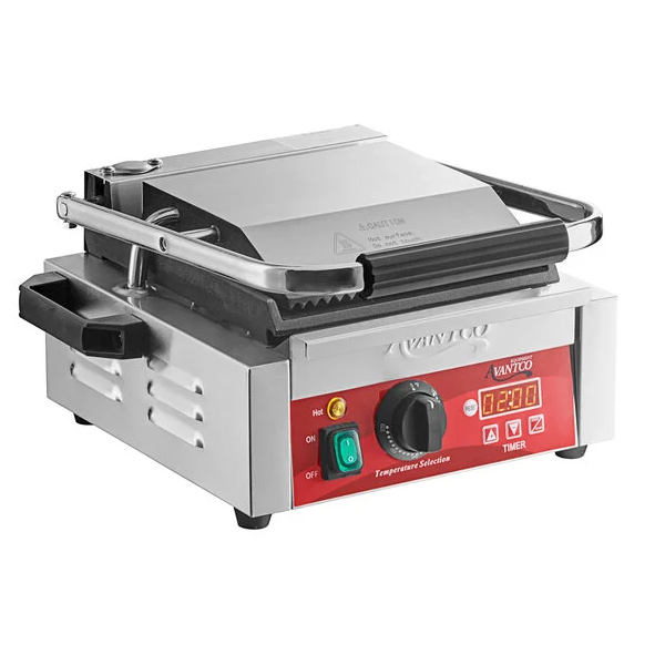 Parrilla Comercial Para Sándwiches Panini Con Temporizador Avantco Pg100Gst Placas Superiores Ranuradas E Inferiores Lisas, Y Superficie De Cocción De 8 1/2 X 8 1/2 – 120 V, 1750 W