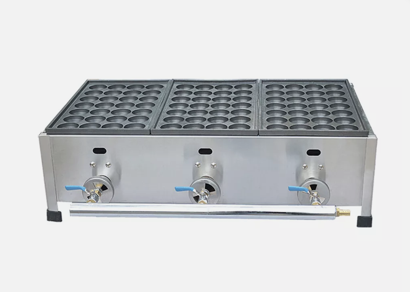 TOCOYAKI GRILL COMERCIAL CON 3 PLACAS DE GAS DIAMETRO DE 40MM, PROFUNDIDAD DE HOYO 25 MM, MEDIDA GENERAL: 630x460x195MM, PESO 17 KG