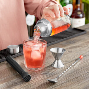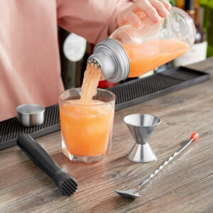 - Jigger: Dispositivo de medición que ayuda a verter la cantidad precisa de licor o ingredientes en un cóctel.